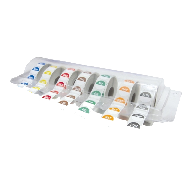 Pack of seven Day Dot rolls, one roll for each day of the week, neatly stored in a durable plastic container.Designed to simplify food rotation and date labeling, this set helps maintain clear organization and supports safe food handling. Ideal for professional kitchens and food service environments.