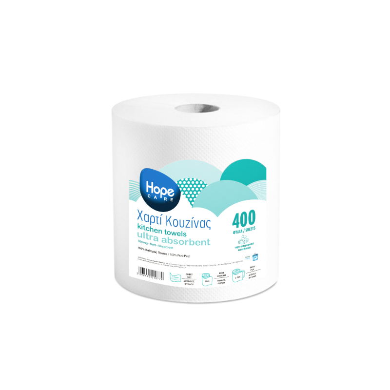 Χαρτί κουζίνας Hope Care από καθαρό πολτό, με ανάγλυφη υφή για αυξημένη απορροφητικότητα και αντοχή. Κάθε ρολό περιέχει 400 φύλλα συνολικού μήκους 80 μ., ιδανικό για καθημερινή καθαριότητα στην κουζίνα.
