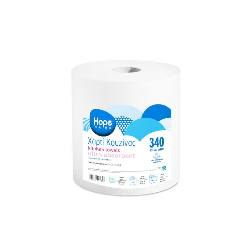 Χαρτί κουζίνας Hope Care από καθαρό πολτό, με ανάγλυφη υφή για αυξημένη απορροφητικότητα και αντοχή. Κάθε ρολό περιέχει 340 φύλλα συνολικού μήκους 68 μ., ιδανικό για καθημερινή καθαριότητα στην κουζίνα.